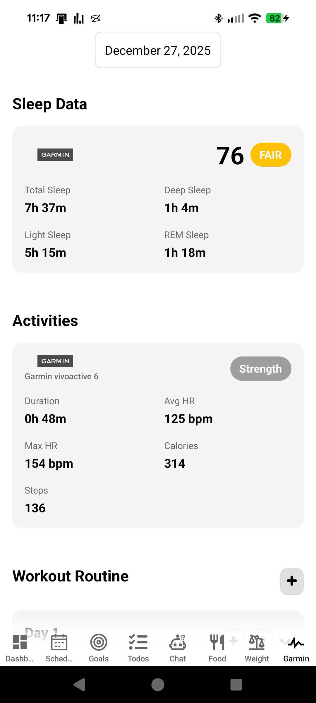 The Garmin tab also includes a workout routine section where you can create and save your workout routines. This feature helps you remember your workouts and access them easily whenever you need them. Instead of trying to recall what exercises you did last time or what your routine was, you can create a routine once and then quickly pull it up whenever you're ready to work out.